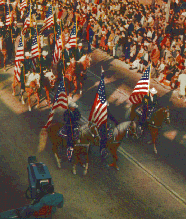 First major US nationwide colour television broadcast: the Tournament of Roses Parade from Pasadena, California [right; photo NBC] Signals are carried over a newly configured network of AT&T long lines to 20 or more cities (reports vary between 20 and 22). The FCC gives a special dispensation to allow the broadcast within the 30-day delay imposed in the approval of the colour system. |
