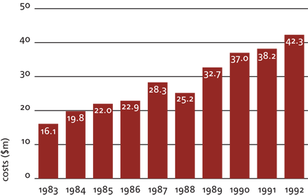 Media > Cinema and film > Negative costs During the 1980s the cost of making feature films in Hollywood increased by around 250 per cent. The chart shows the increase in negative and P&A (print and advertising) costs over the 10-year period between 1983 and 1992. Negative and P&A costs Source of data: Motion Picture Association of America (MPA)