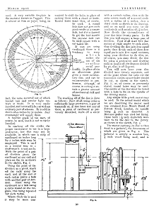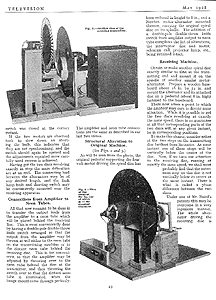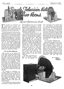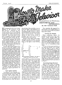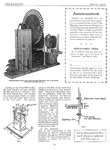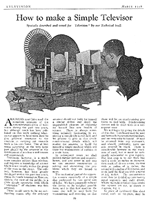 Many of the earliest television receivers were home made, either from parts bought by hobbyists from electrical suppliers or from kits sold by Baird Television. These articles were published in Television, the 'official organ of the Television Society', between March and May 1928. They give full instructions of how to build a Televisor and operate a television link between two rooms.