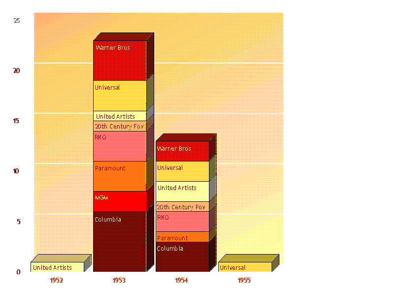 Width or depth? As the Hollywood studios did not know what the public would respond to in the cinema as television started to encroach, they backed both ideas: wide-screen and three-dimensional imaging. We know now the outcome. The world was not ready for stereoscopy. The burst of 3-D production was briefit was all over in a couple of years and those films that have continued in distribution are now seen in flat versions, except for occasional special presentations. Majors' 3-D film releases Source of data: Joel W Finler: The Hollywood Story, 1988