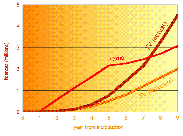 In the chart radio starts in 1922 and television in 1947. The forecasts made by the Television Advisory Committee in June 1949 (year three) were 50 per cent understated within two years and 100 per cent within five years.