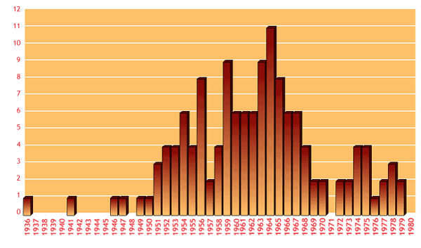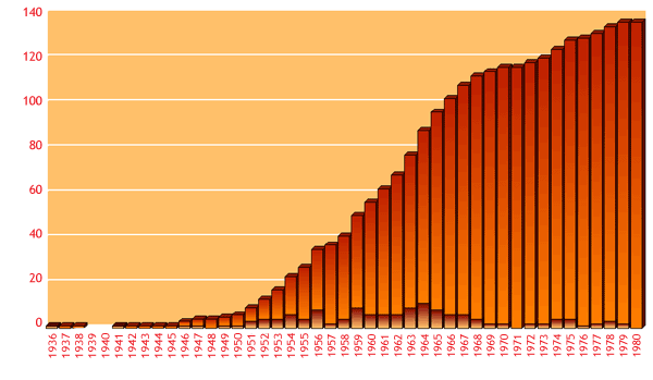 Media > Television index > Start of television services The chart shows the number of new national television services each year. It clearly shows the build-up to a peak in 1964, by which time virtually all major territories had a service. Thereafter it was mainly the smaller and developing nations that were catching up. The second chart shows the number of new national television services each year (the small gold bars) combined with the cumulative total of countries with television services (dark red). Even dissemination of technology on this level appears to obey the classic S-curve distribution that applies to consumer electronics. Television service starts dates listingPage updated 19 August 2008 |